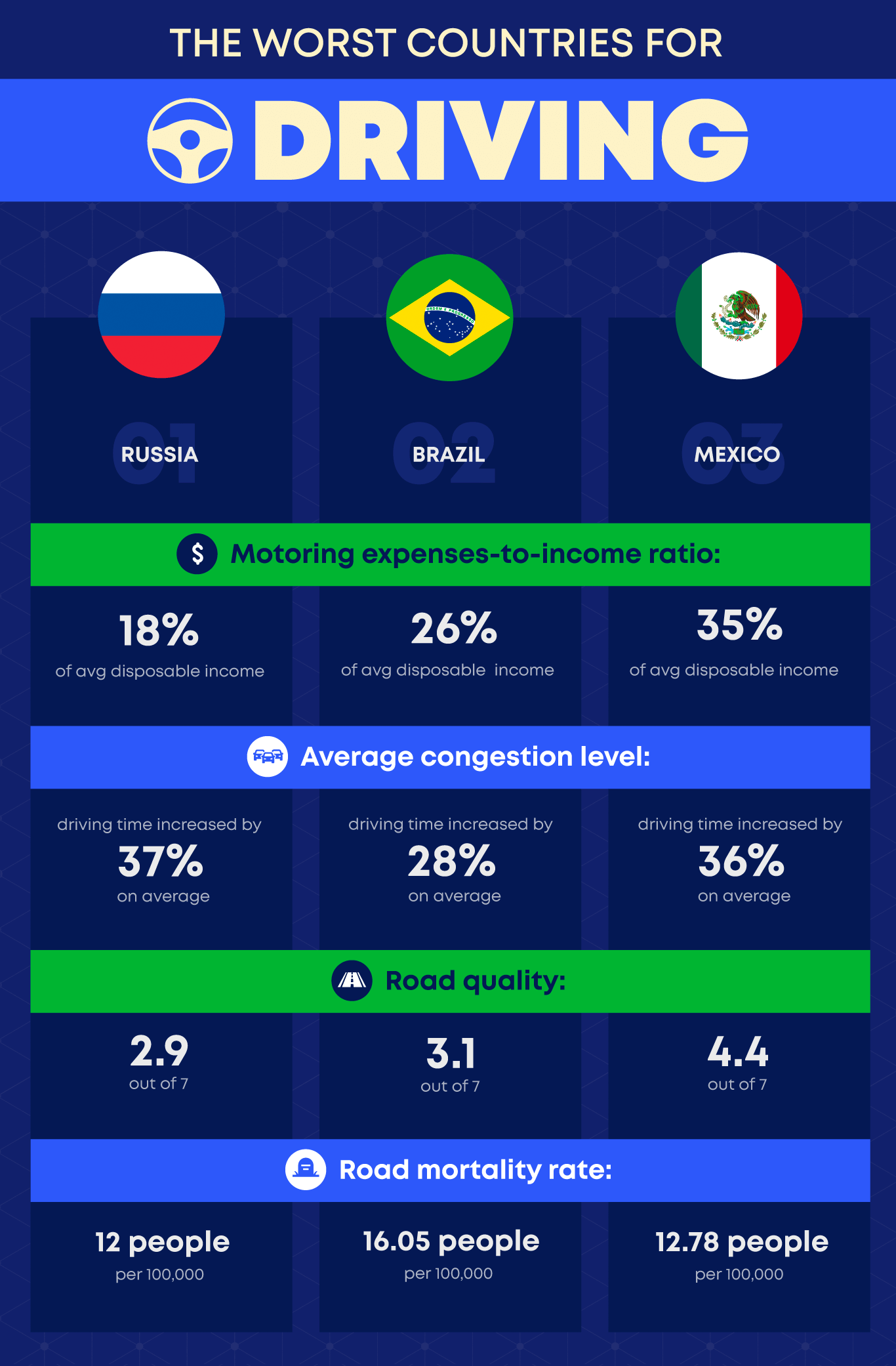 Brazil had the highest road mortality rate out of the three worst-performing nations, though it wasn’t the worst score across all our metrics. Expensive motoring costs, high congestion and poor roads brought it down to second-last place.