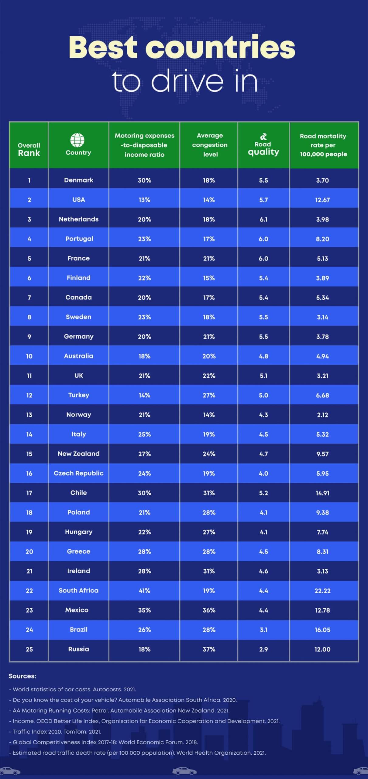 We took a look at a variety of factors to figure out which nation is arguably the best one for driving in. We gathered data on annual operating costs in relation to disposable income, congestion levels, road quality and road mortality across 25 different countries, then put them all together to form a ranking. Read more about how we did this in our methodology.