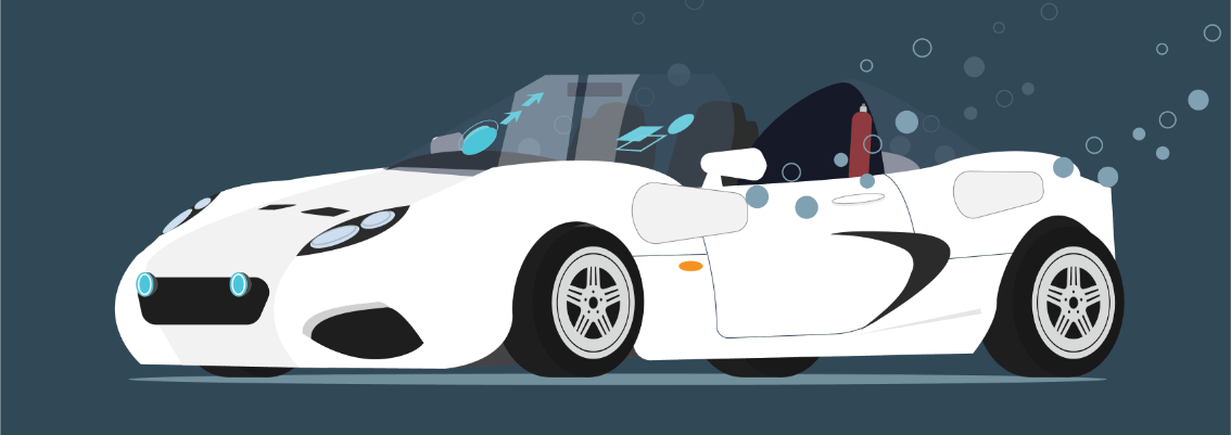 Our extremely modified car design has an electric engine, jets on the side so it can dive underwater, oxygen tanks on the inside, a projected HUD and additional fog lights on the front.