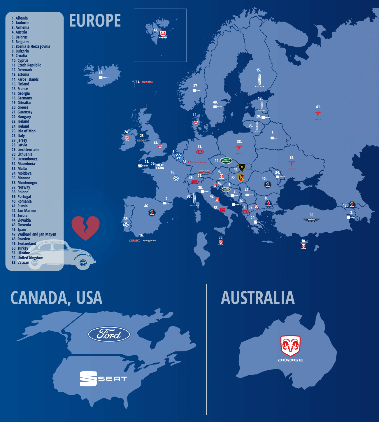 To determine the car brands included within the campaign, we used Statista and YouGov, then to determine the car brands with the most positive and negative sentiment per country, we used the Linkfluence sentiment tool, which crawls data on mentions across the internet from the past 12 months. We then picked out the brand with the largest percentage of positive and negative sentiment, to determine which one people talk about the most positively, and which one people would avoid or feel angriest about, across Europe, America, Canada and Australia.