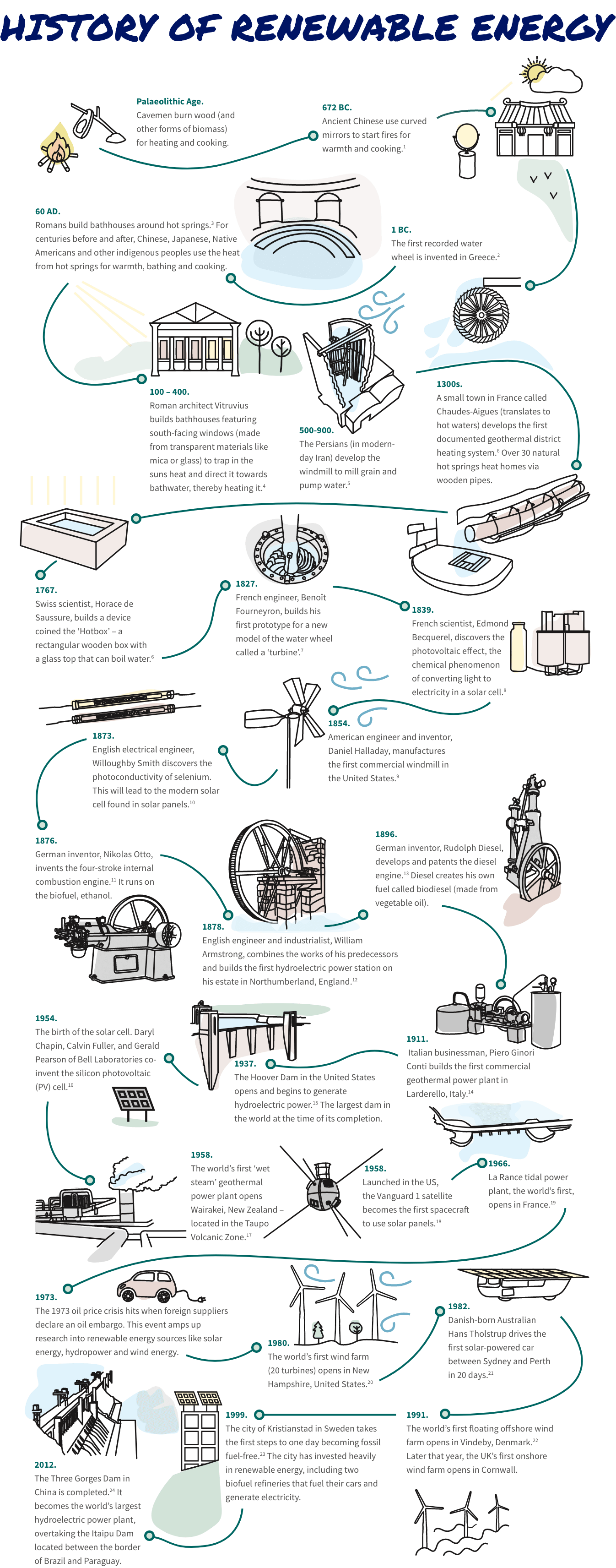 Our timeline tracks the evolution of the five oldest and most popular renewable energy sources – from their primitive use, through the industrial revolution and into the 21st century.