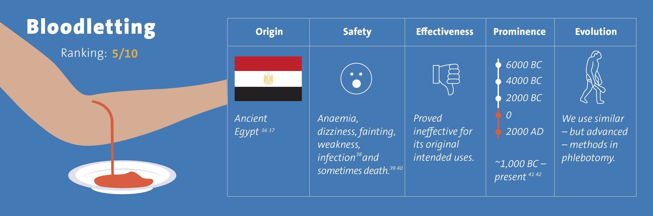 Today, bloodletting is known as phlebotomy and exists to help doctors diagnose illnesses by testing your blood.48 However, bloodletting exists for disorders like polycythemia vera – a condition where your body produces too many blood cells; bloodletting is used to remove excess blood units.49