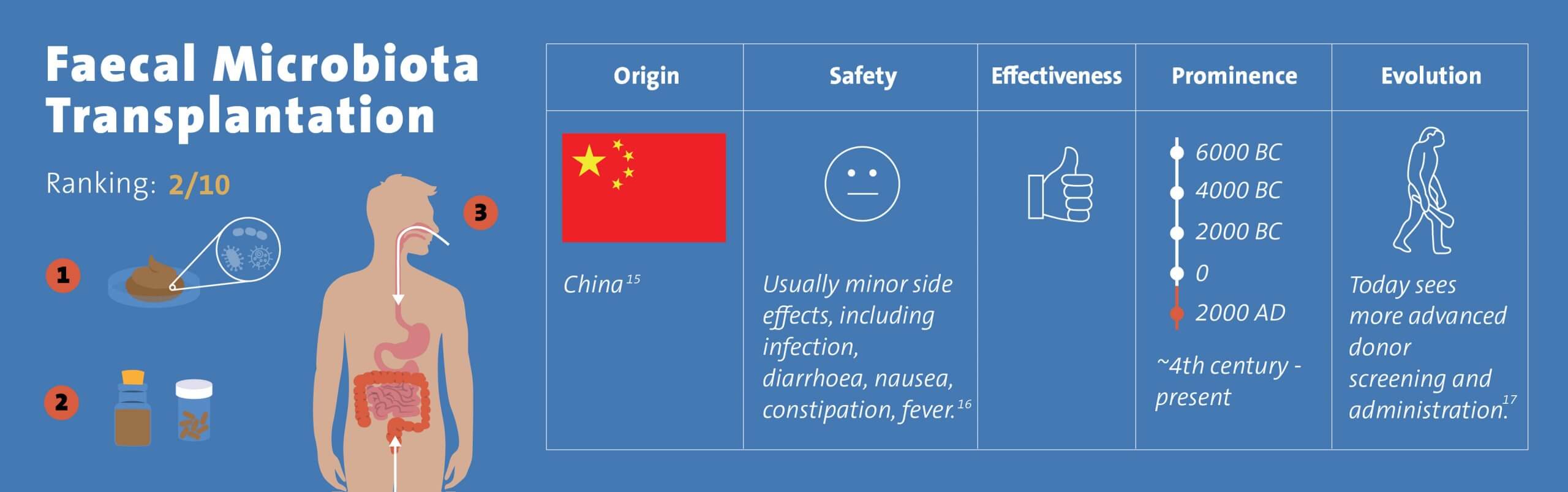 One way to help correct this imbalance is through faecal microbiota transplantation (FMT). That is, taking a healthy donor’s gut microflora from their stool – or a product processed from their stool – and placing it into the bowel of someone with gut issues.20 Such treatment is typically targeted towards those with inflammatory bowel diseases and other conditions or infections.21