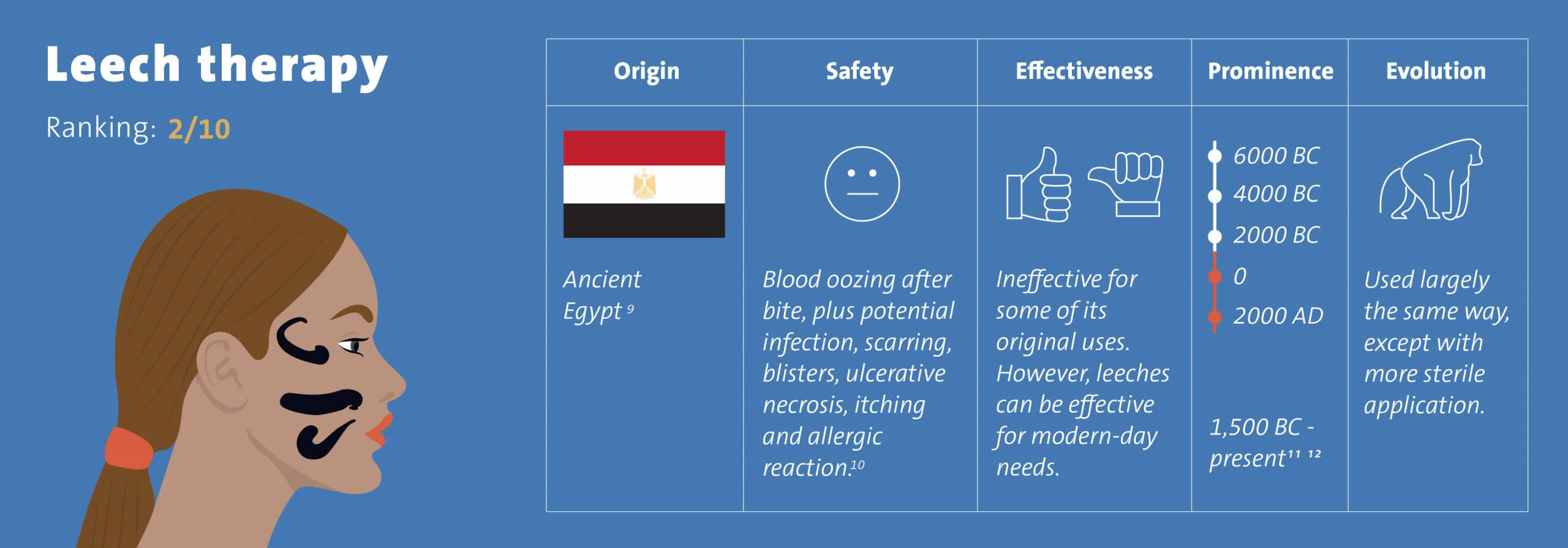 Leeches’ anticoagulant powers have been harnessed through history, seemingly since Ancient Egypt. This practice aided bloodletting (which we discuss further below) and helped treat a range of ailments, from dental issues and rheumatic pains to inflammation, hearing loss and even casting out evil spirits.