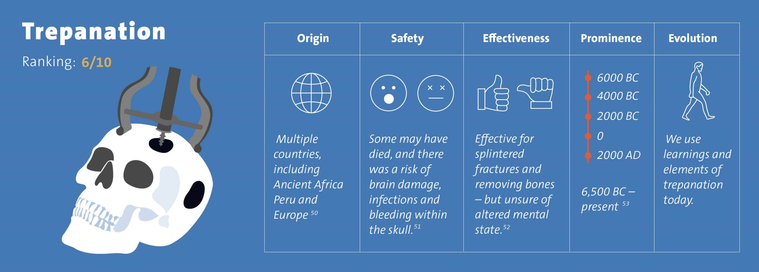 It’s curious to wonder if this practice has informed medicine throughout the ages, or if it remains frozen in the pages of the Edwin Smith Papyrus. As such, we’ve averaged out the scores for effectiveness and prominence to offer a more representative view. We also averaged the score of safety, based on our trepanation research.