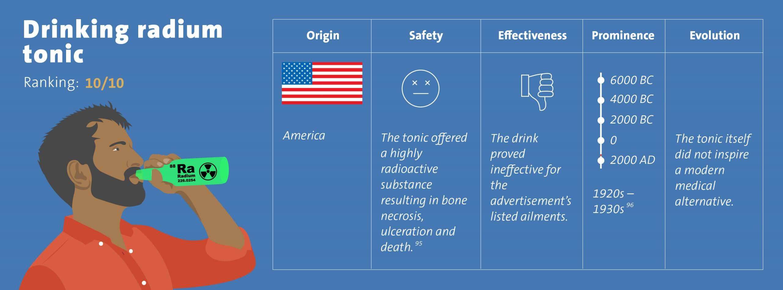One such product, ‘RadiThor’, graced the shelves in the 1920s in 30-millilitre bottles (one-ounce bottles) for US$1 a pop.97 RadiThor was advertised to help treat an alphabet of ailments, from anemia and asthma to kidney disease and virility.98