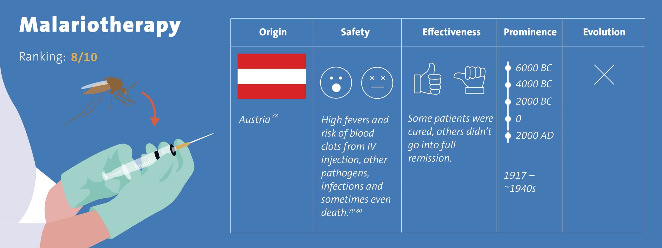 As malaria would cause dangerous fever attacks (where a patient could reach up to 40 degrees Celsius – or 104 degrees Fahrenheit), Wagner-Jauregg thought it would help kill the bacteria that caused the syphilitic infection. It largely appeared to work!84