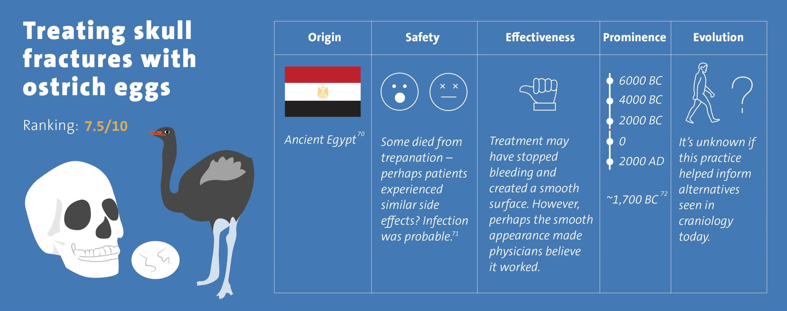The Edwin Smith Papyrus contains the earliest known writings on medical observations. According to translations of this text and scholarly articles, the document suggests using ground ostrich eggshells to help patch up skull fractures.73,74