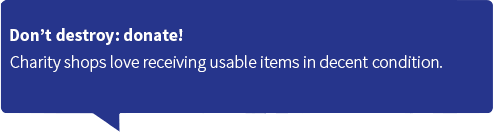 A word on donating: Charity shops love receiving usable items in decent condition. Don’t donate anything that’s overly worn, broken or missing pieces. Make sure items are clean before you bundle them off to the charity shop. If you’re donating big items (like furniture), some charity shops will come and collect it from you; all you need to do is call them to arrange a pickup. Don’t donate rubbish, just bite the bullet and put that stuff in the bin.