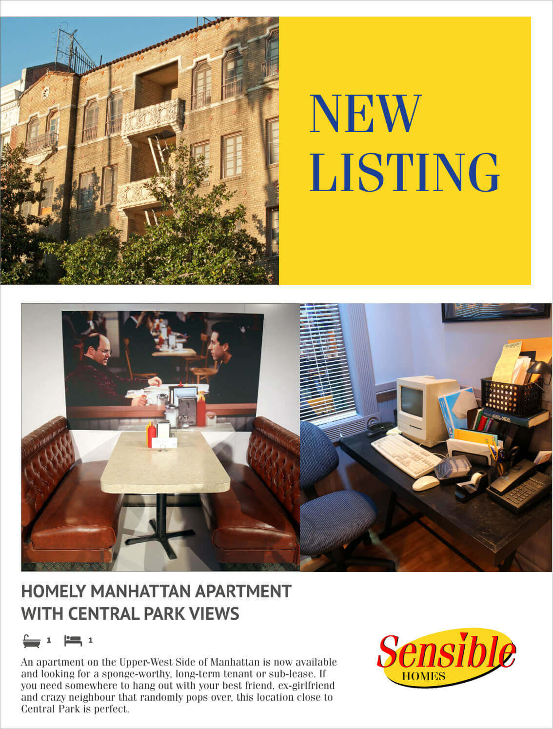 The apartment comes with a bathroom (just your standard tub/sink/toilet New York combo, but be wary of the low-flow showerhead) and bedroom, as well as a hidden tool shed and stock room. It’s also within walking distance to Monk’s café, H&H Bagels, a Chinese restaurant with ridiculously long wait times and a soup place that will leave you stunned (seriously, you can’t eat it standing up – your knees will buckle).