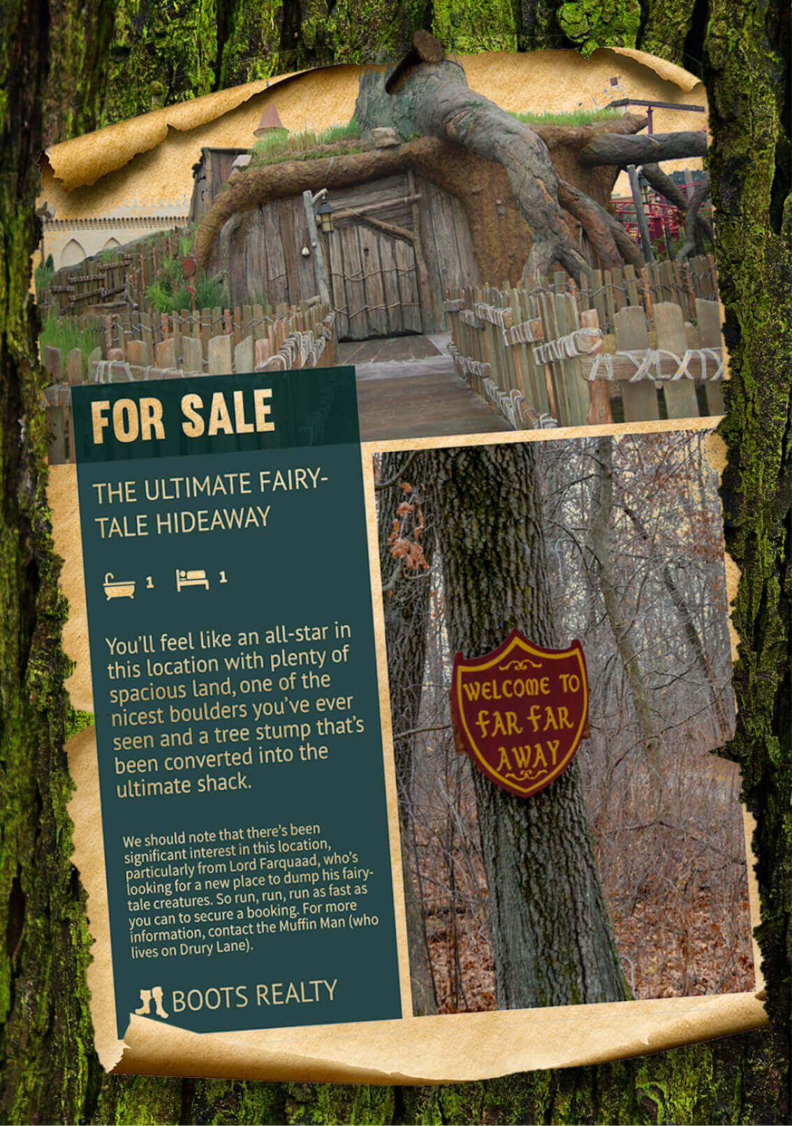 While it’s a perfectly suitable location for even the loneliest of beasts, it’s also the ideal place to settle down with a princess you rescued from a tower, to raise baby ogres and dronkeys or to share with your noble steed! Previous occupants include Pinocchio, Snow White and the Big Bad Wolf (there may have also been a brief blind mice infestation in the past).