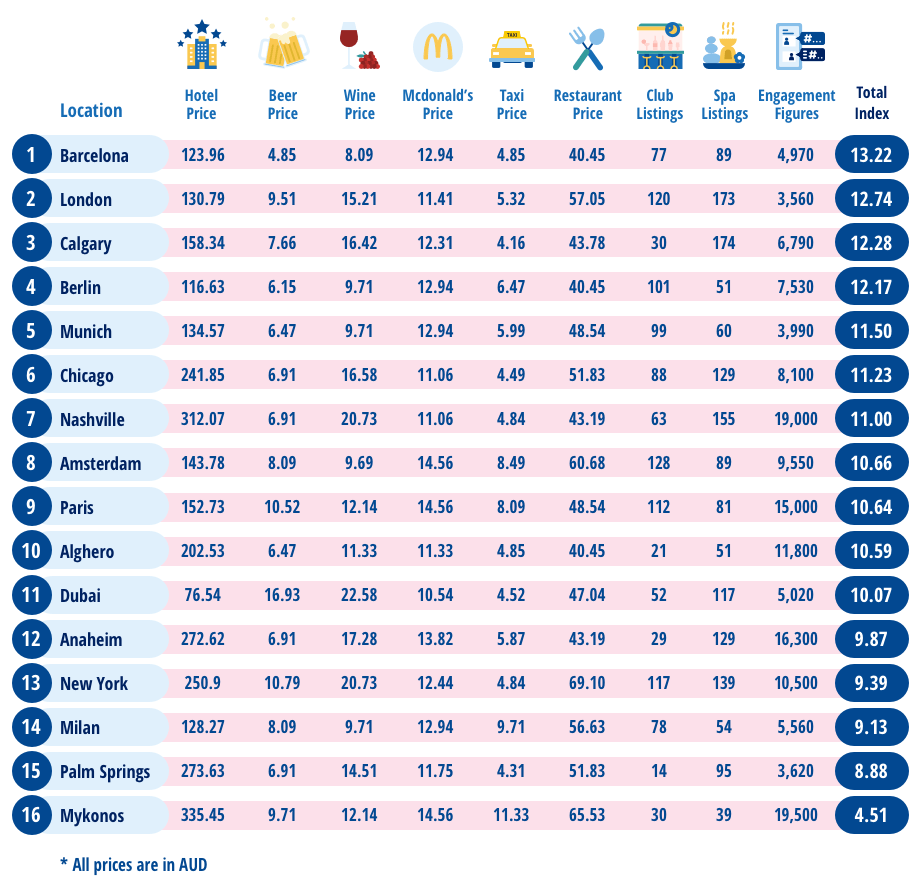 Top of the list is Barcelona, where a bottle of wine in a supermarket will cost you $8.09, and a hotel will set you back by $123.96 AUD per night – the third cheapest on our entire list, with only Dubai and Berlin offering cheaper rooms on average.