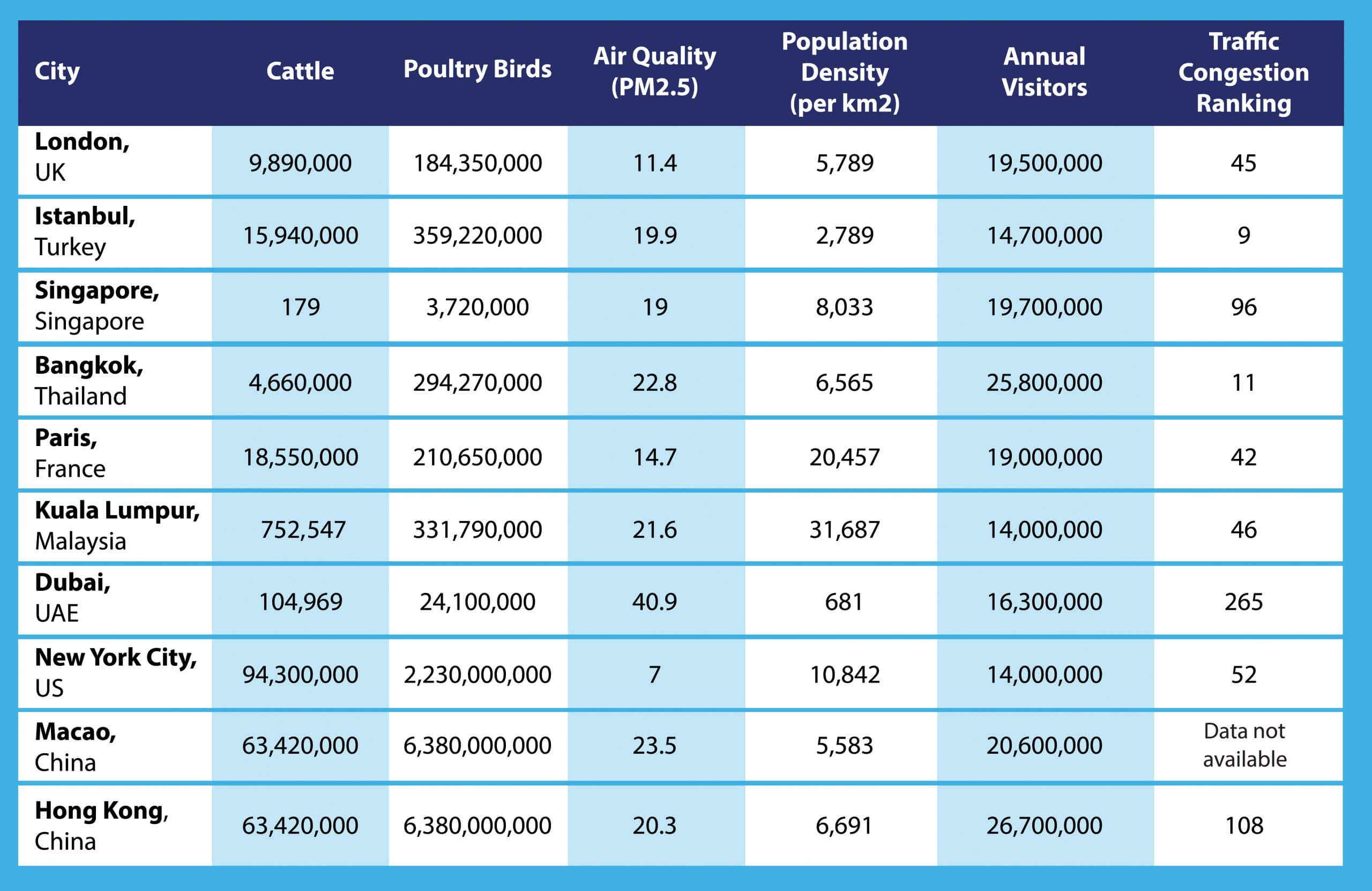 Components used to develop a score are number of cattle by country of city (2018), number of poultry birds by country of city (2018), air quality PM2.5 (annual average 2019), population density per km2 (2019), annual visitors (2019) and most traffic congestion world city ranking (2019).