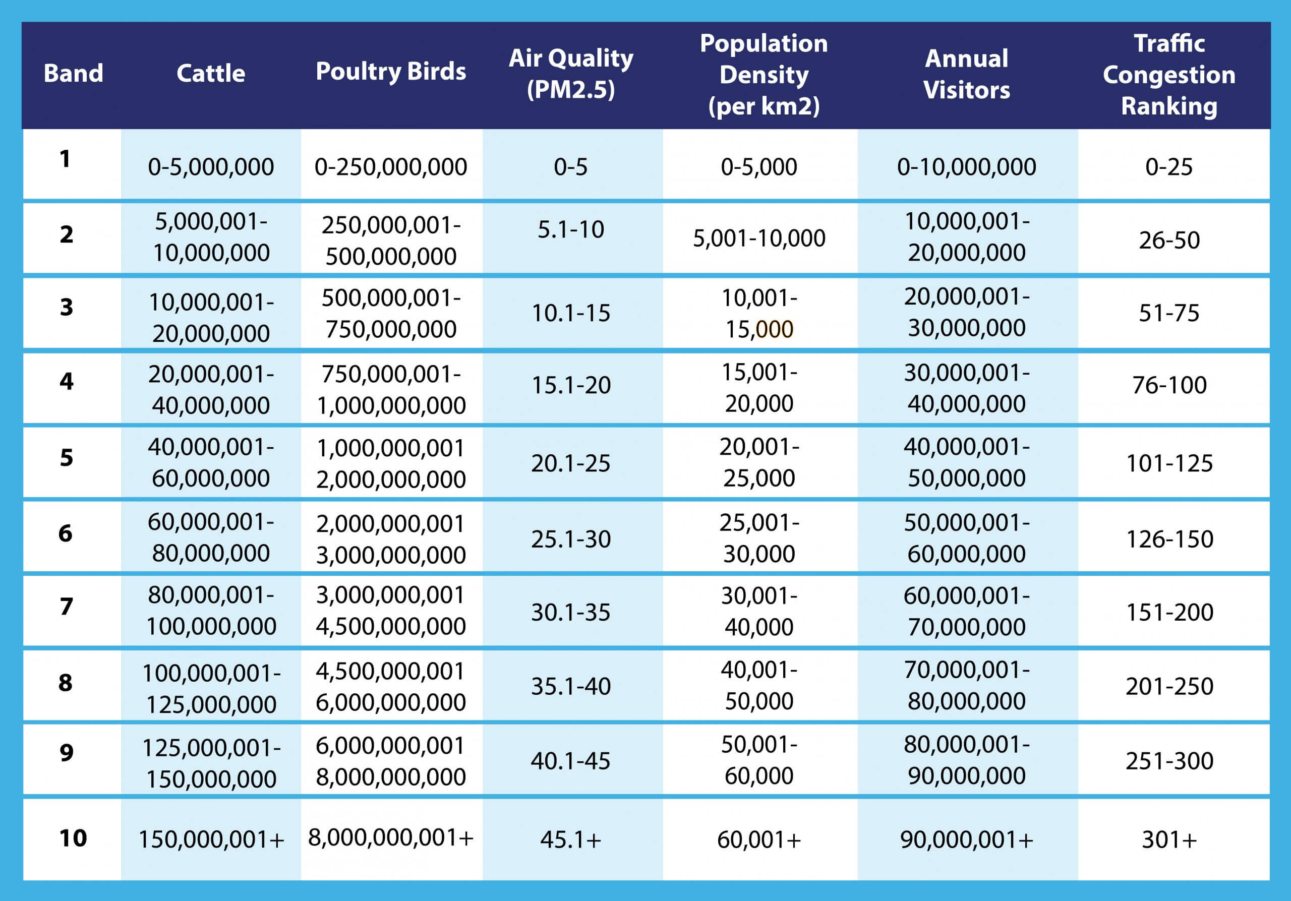 In order to calculate these bands, objective data ranges were created that represent the current component sizes for each city while allowing room for growth in the future. Band ranges are increased to larger amounts at certain points as the bands get higher to allow for scaling of the data. The number of bands can extend beyond ten where needed, based on the continuous ascending value pattern. In order to represent components with a lower effect on air quality based on the research in this article, some bands have a wider range which reduces the effect on the overall score.