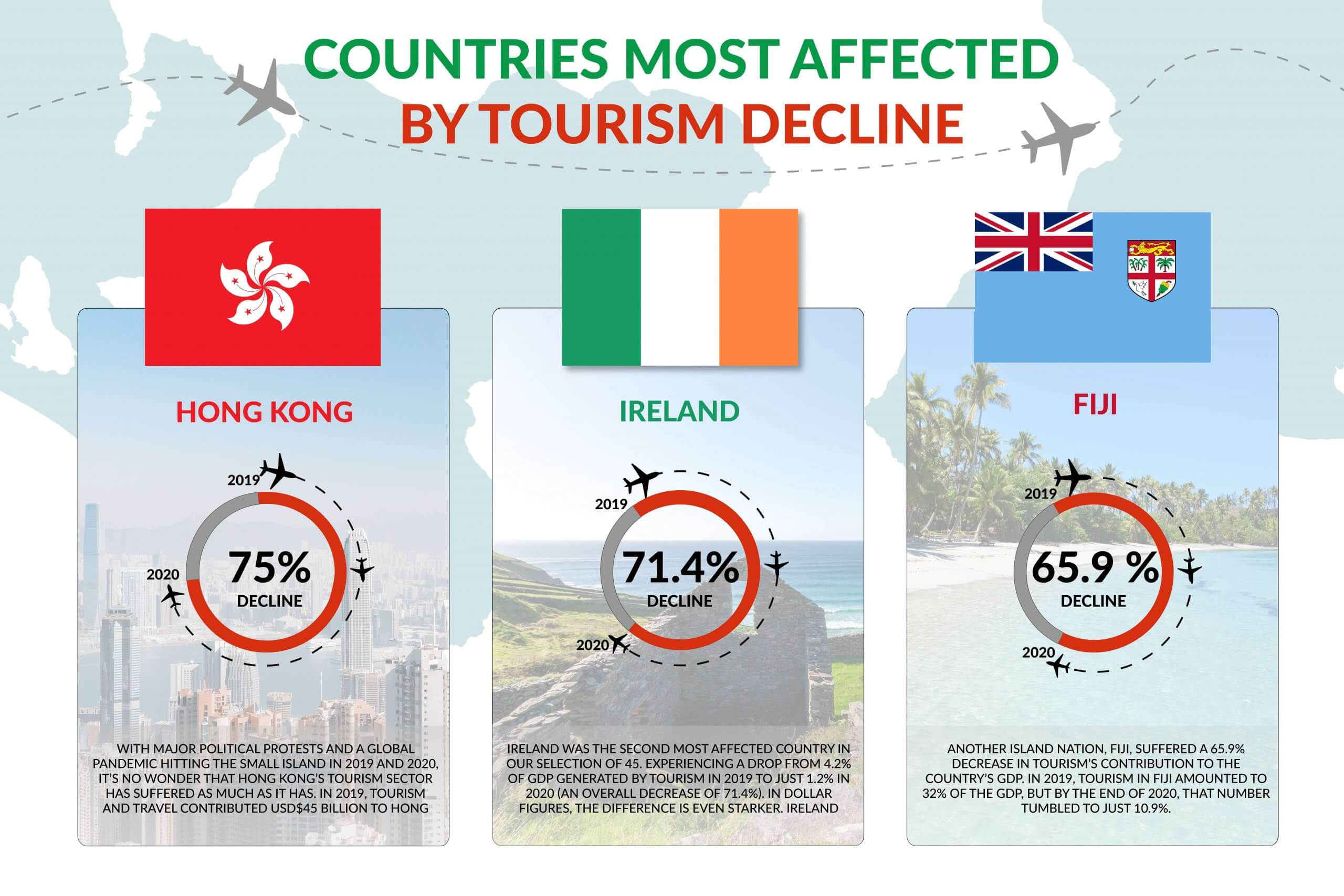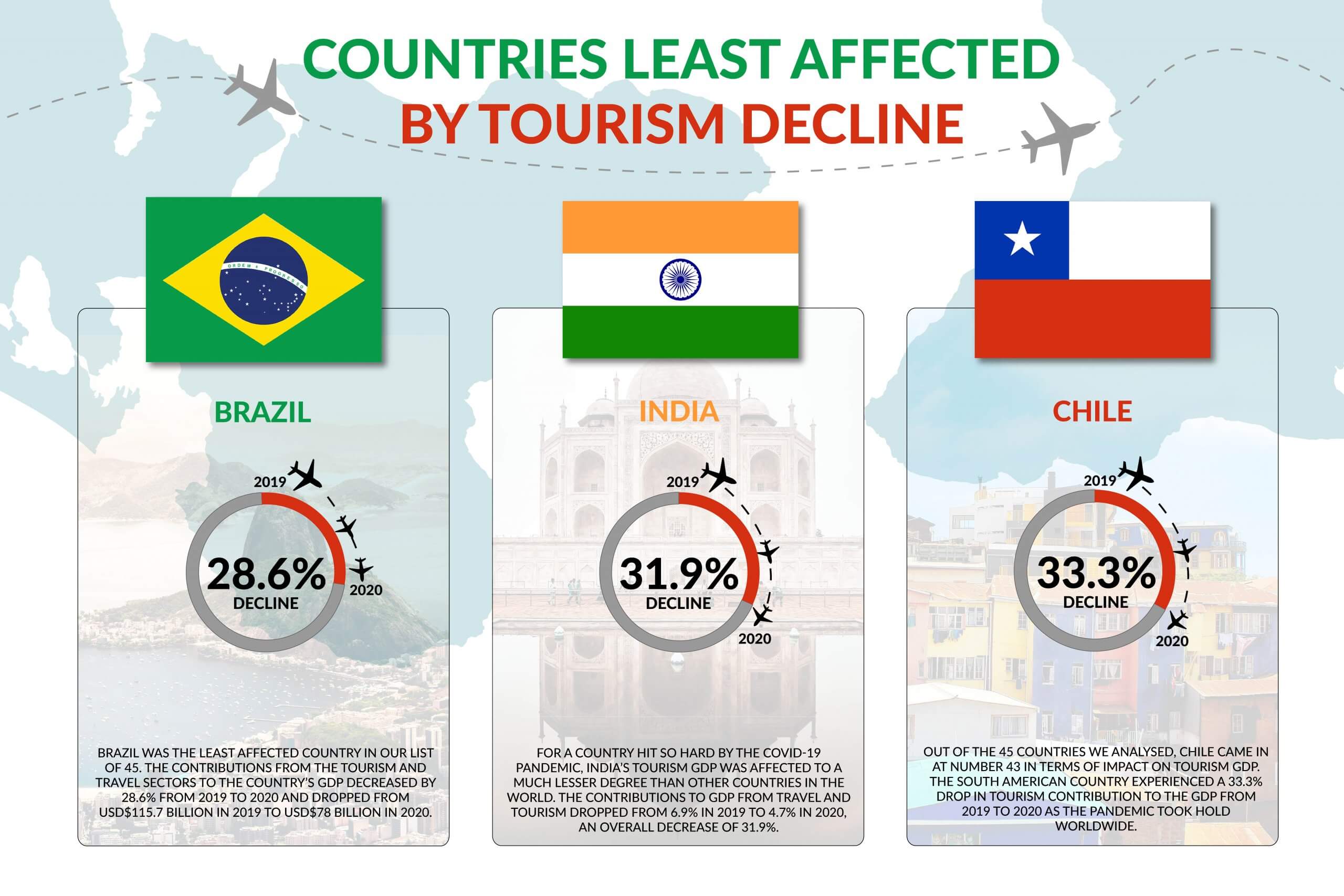 We consulted the Economic Impact Reports from the World Travel & Tourism Council (WTTC) for various countries, narrowing it down to 45 and ensuring representation from all continents. These reports include the “total contribution of travel and tourism to GDP” as a percentage figure of the country’s total economy for both 2019 and 2020.